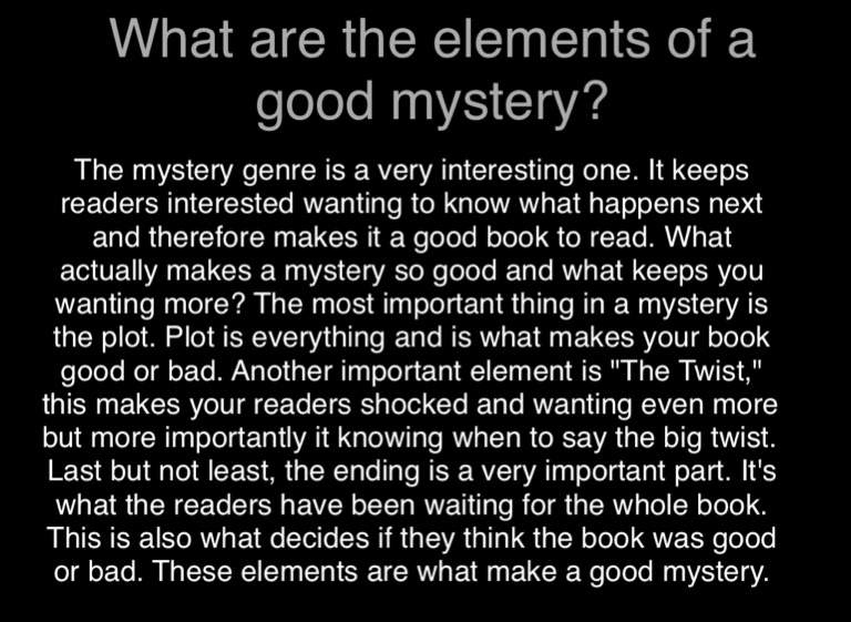 The mystery genre is a very interesting one. It keeps readers interested wanting to know what happens next and therefore makes it a good book to read. What actually makes a mystery so good and what keeps you wanting more? The most important thing in a mystery is the plot. Plot is everything and is what makes your book good or bad. Another important element is "The Twist," this makes your readers shocked and wanting even more but more importantly it knowing when to say the big twist. Last but not least, the ending is a very important part. It's what the readers have been waiting for the whole book. This is also what decides if they think the book was good or bad. These elements are what make a good mystery.