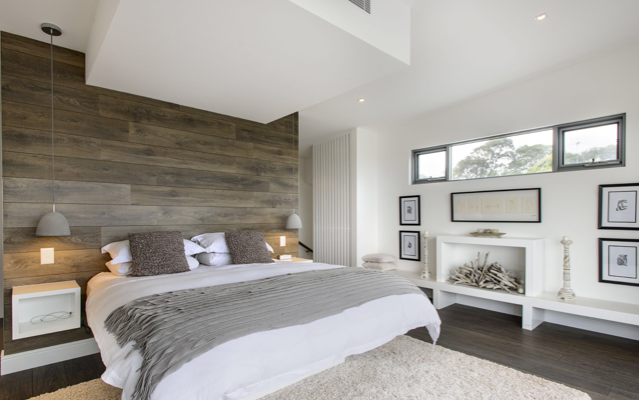 *Texture from wood accent wall, rug, wood sticks, pillows, etc provides compliment to the sleek, clean lines from bed, shelves, and other furniture