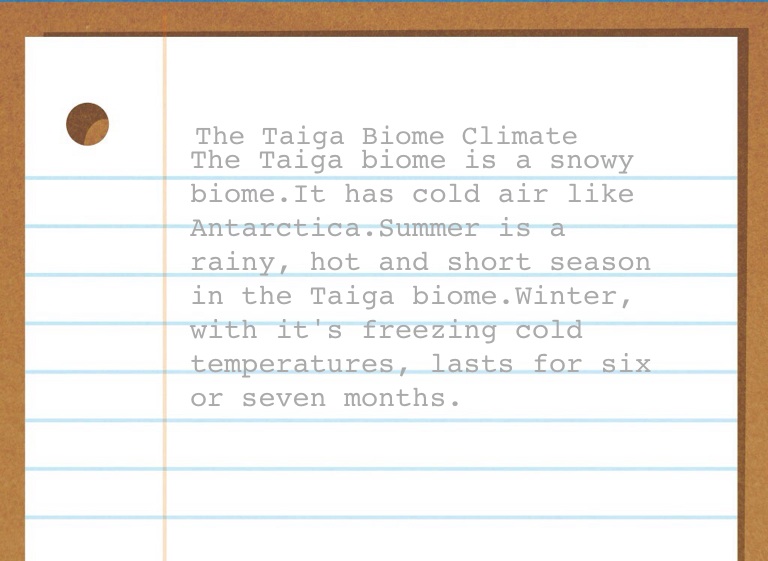 The Taiga biome is a snowy biome.It has cold air like Antarctica.Summer is a rainy, hot and short season in the Taiga biome.Winter, with it's freezing cold temperatures, lasts for six or seven months.