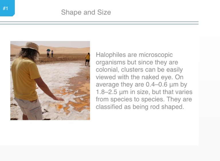 Halophiles are microscopic organisms but since they are colonial, clusters can be easily viewed with the naked eye. On average they are 0.4–0.6 μm by 1.8–2.5 μm in size, but that varies from species to species. They are classified as being rod shaped.