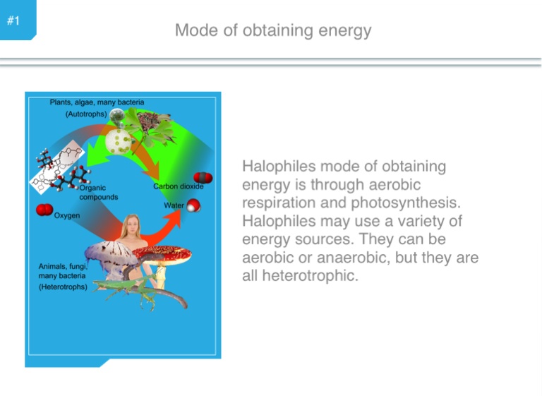 Halophiles mode of obtaining energy is through aerobic respiration and photosynthesis. Halophiles may use a variety of energy sources. They can be aerobic or anaerobic, but they are all heterotrophic.