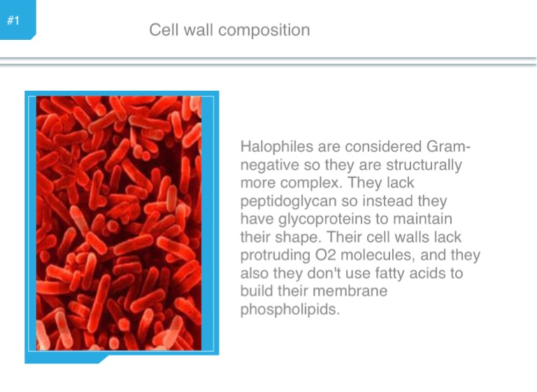 Halophiles are considered Gram-negative so they are structurally more complex. They lack peptidoglycan so instead they have glycoproteins to maintain their shape. Their cell walls lack protruding O2 molecules, and they also they don't use fatty acids to build their membrane phospholipids.