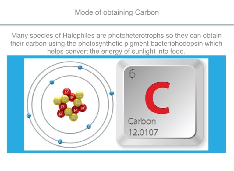 Many species of Halophiles are photoheterotrophs so they can obtain their carbon using the photosynthetic pigment bacteriohodopsin which helps convert the energy of sunlight into food.