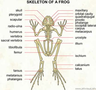 The skeletal system of a frog is much more complex than that of a clam. Since the frog is a vertebrate it contains a backbone. The skeletal system can be broken up into two different parts: an axial skeleton and an appendicular skeleton. The axial skeleton contains the skull, vertebrae and sternum. Th appendicular skeleton contains the pectoral, pelvic, and limb bones.