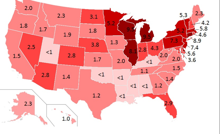 Below is a map of the United States in 2010. This shows what percent of the population of every state is Polish Americans