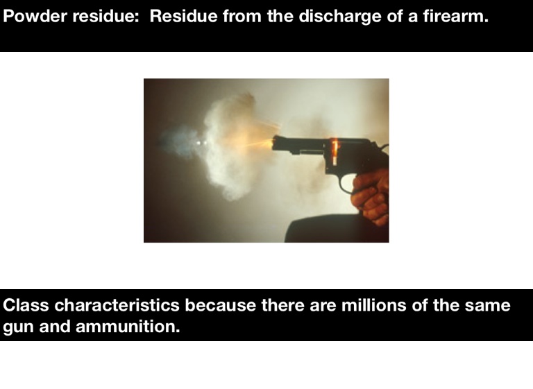 Powder residue: Residue from the discharge of a firearm.