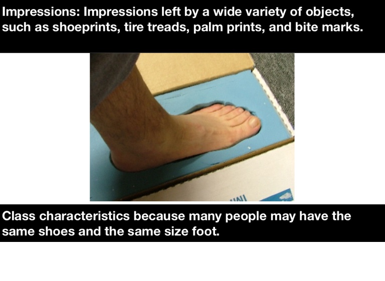 Impressions: Impressions left by a wide variety of objects, such as shoeprints, tire treads, palm prints, and bite marks.