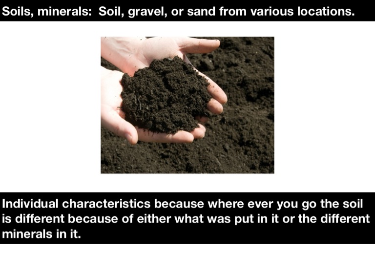 Individual characteristics because where ever you go the soil is different because of either what was put in it or the different minerals in it.