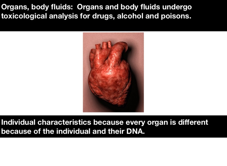 Organs, body fluids: Organs and body fluids undergo toxicological analysis for drugs, alcohol and poisons.