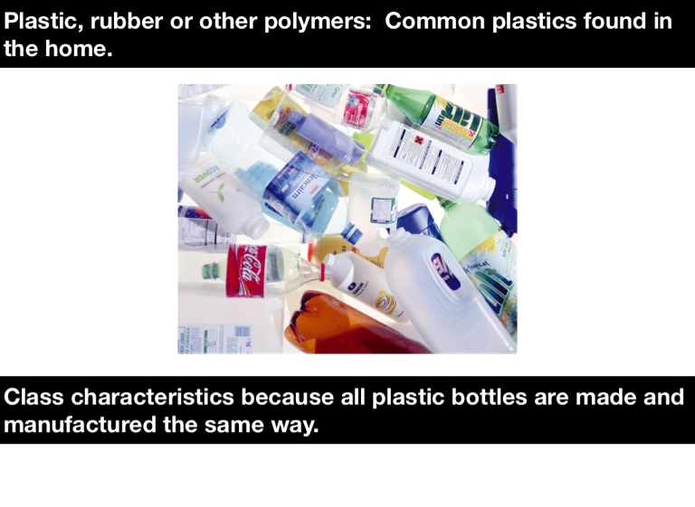 Plastic, rubber or other polymers: Common plastics found in the home.