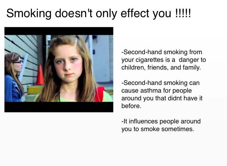 -Second-hand smoking from your cigarettes is a danger to children, friends, and family. -Second-hand smoking can cause asthma for people around you that didnt have it before. -It influences people around you to smoke sometimes.