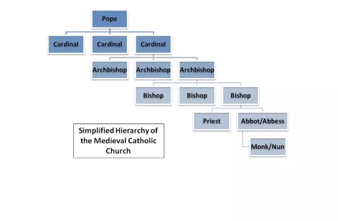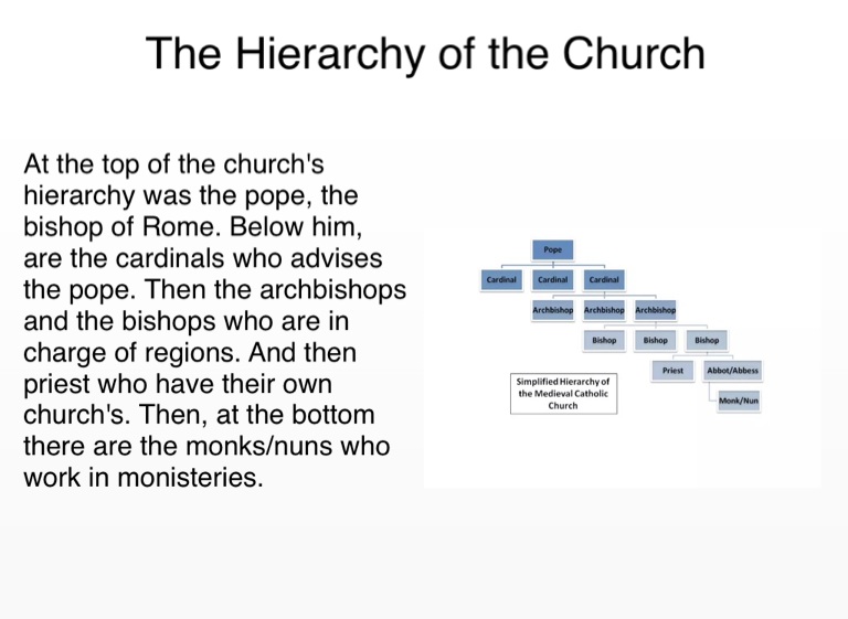 At the top of the church's hierarchy was the pope, the bishop of Rome. Below him, are the cardinals who advises the pope. Then the archbishops and the bishops who are in charge of regions. And then priest who have their own church's. Then, at the bottom there are the monks/nuns who work in monisteries.