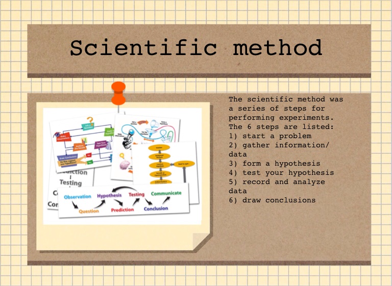 The scientific method was a series of steps for performing experiments. The 6 steps are listed: 1) start a problem