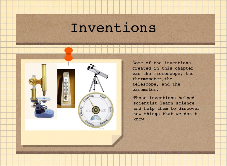 Some of the inventions created in this chapter was the microscope, the thermometer,the telescope, and the barometer.