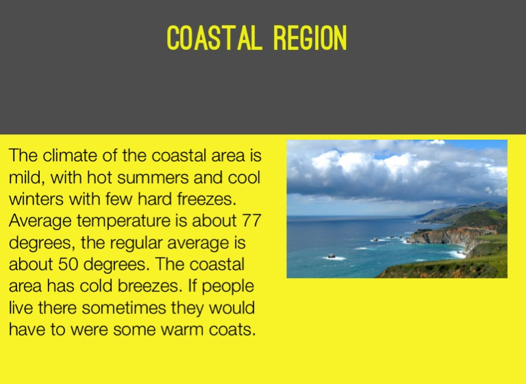 The climate of the coastal area is mild, with hot summers and cool winters with few hard freezes. Average temperature is about 77 degrees, the regular average is about 50 degrees. The coastal area has cold breezes. If people live there sometimes they would have to were some warm coats.