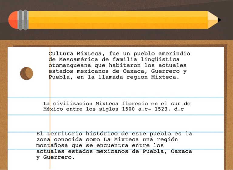 Cultura Mixteca, fue un pueblo amerindio de Mesoamérica de familia lingüística otomangueana que habitaron los actuales estados mexicanos de Oaxaca, Guerrero y Puebla, en la llamada region Mixteca.