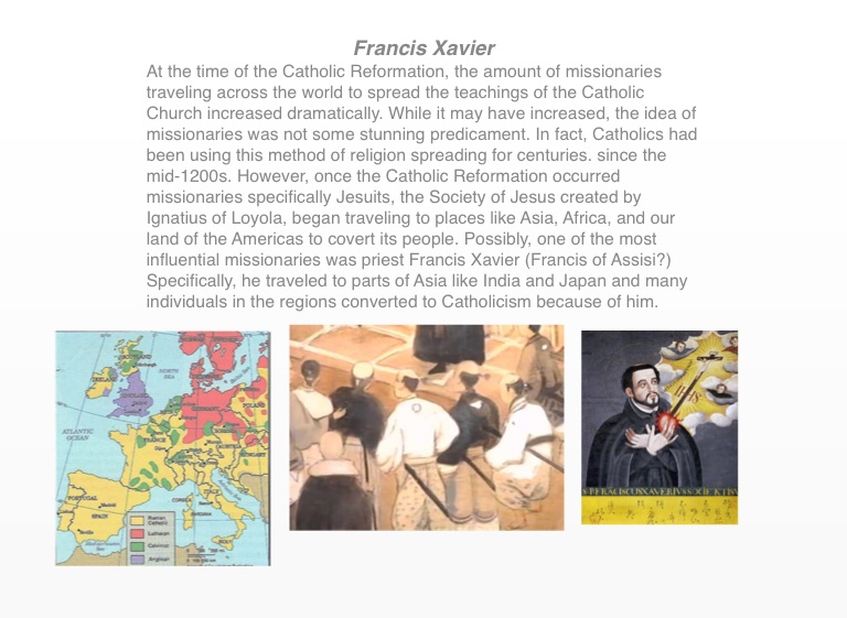 At the time of the Catholic Reformation, the amount of missionaries traveling across the world to spread the teachings of the Catholic Church increased dramatically. While it may have increased, the idea of missionaries was not some stunning predicament. In fact, Catholics had been using this method of religion spreading for centuries. since the mid-1200s. However, once the Catholic Reformation occurred missionaries specifically Jesuits, the Society of Jesus created by Ignatius of Loyola, began traveling to places like Asia, Africa, and our land of the Americas to covert its people. Possibly, one of the most influential missionaries was priest Francis Xavier (Francis of Assisi?) Specifically, he traveled to parts of Asia like India and Japan and many individuals in the regions converted to Catholicism because of him.