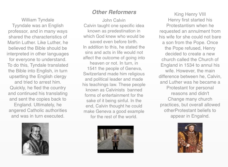 Henry first started his Protestantism when he requested an annulment from his wife for she could not bare a son from the Pope. Once the Pope refused, Henry decided to create a new church called the Church of England in 1534 to annul his wife. However, the main difference between he, Calvin, and Luther was he became a Protestant for personal reasons and didn't