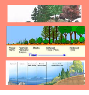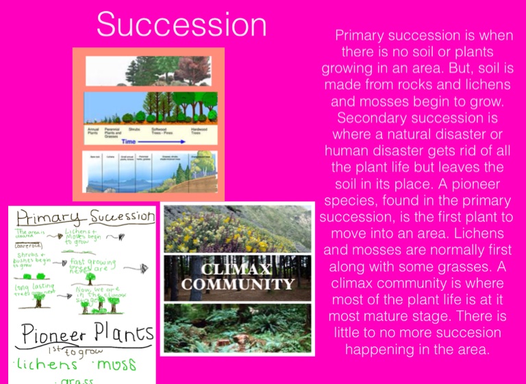 Primary succession is when there is no soil or plants growing in an area. But, soil is made from rocks and lichens and mosses begin to grow. Secondary succession is where a natural disaster or human disaster gets rid of all the plant life but leaves the soil in its place. A pioneer species, found in the primary succession, is the first plant to move into an area. Lichens and mosses are normally first along with some grasses. A climax community is where most of the plant life is at it most mature stage. There is little to no more succesion happening in the area.