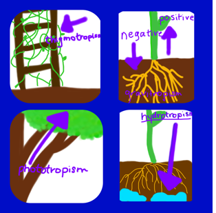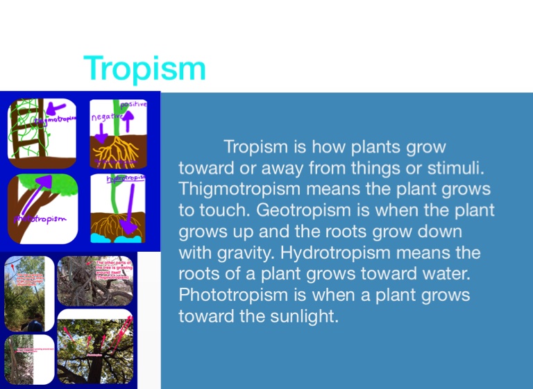 Tropism is how plants grow toward or away from things or stimuli. Thigmotropism means the plant grows to touch. Geotropism is when the plant grows up and the roots grow down with gravity. Hydrotropism means the roots of a plant grows toward water. Phototropism is when a plant grows toward the sunlight.
