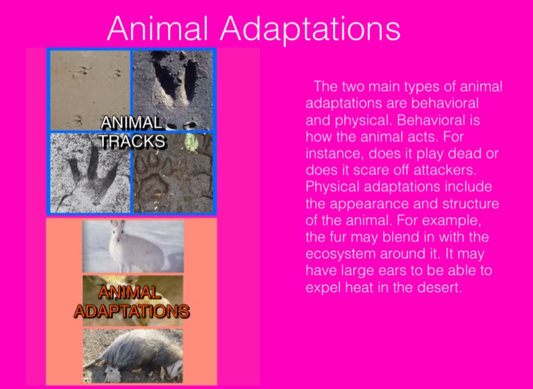 The two main types of animal adaptations are behavioral and physical. Behavioral is how the animal acts. For instance, does it play dead or does it scare off attackers. Physical adaptations include the appearance and structure of the animal. For example, the fur may blend in with the ecosystem around it. It may have large ears to be able to expel heat in the desert.