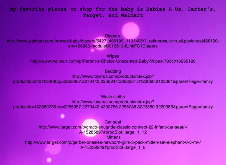 My favorite places to shop for the baby is Babies R Us, Carter's, Target, and Walmart