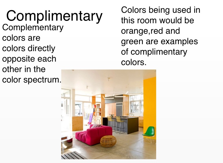 Colors being used in this room would be orange,red and green are examples of complimentary colors.