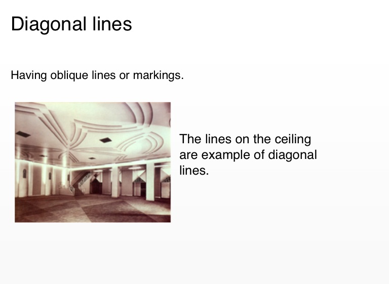 The lines on the ceiling are example of diagonal lines.