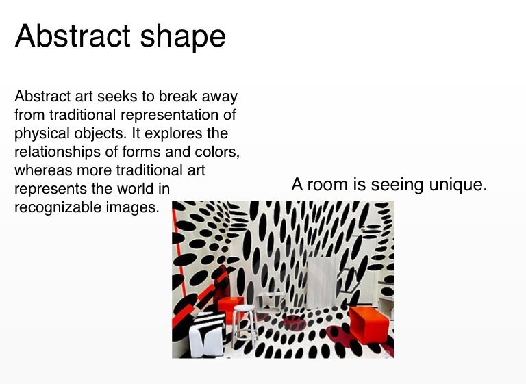 Abstract art seeks to break away from traditional representation of physical objects. It explores the relationships of forms and colors, whereas more traditional art represents the world in recognizable images.