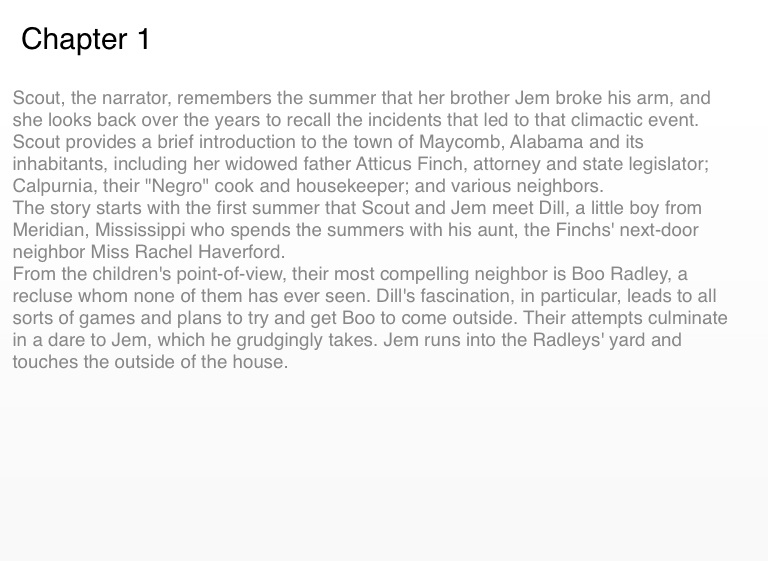 Scout, the narrator, remembers the summer that her brother Jem broke his arm, and she looks back over the years to recall the incidents that led to that climactic event. Scout provides a brief introduction to the town of Maycomb, Alabama and its inhabitants, including her widowed father Atticus Finch, attorney and state legislator; Calpurnia, their "Negro" cook and housekeeper; and various neighbors.