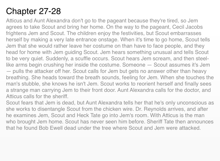 Atticus and Aunt Alexandra don't go to the pageant because they're tired, so Jem agrees to take Scout and bring her home. On the way to the pageant, Cecil Jacobs frightens Jem and Scout. The children enjoy the festivities, but Scout embarrasses herself by making a very late entrance onstage. When it's time to go home, Scout tells Jem that she would rather leave her costume on than have to face people, and they head for home with Jem guiding Scout. Jem hears something unusual and tells Scout to be very quiet. Suddenly, a scuffle occurs. Scout hears Jem scream, and then steel-like arms begin crushing her inside the costume. Someone — Scout assumes it's Jem — pulls the attacker off her. Scout calls for Jem but gets no answer other than heavy breathing. She heads toward the breath sounds, feeling for Jem. When she touches the man's stubble, she knows he isn't Jem. Scout works to reorient herself and finally sees a strange man carrying Jem to their front door. Aunt Alexandra calls for the doctor, and Atticus calls for the sheriff.