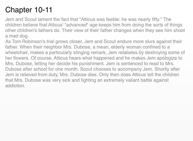 As Tom Robinson's trial grows closer, Jem and Scout endure more slurs against their father. When their neighbor Mrs. Dubose, a mean, elderly woman confined to a wheelchair, makes a particularly stinging remark, Jem retaliates by destroying some of her flowers. Of course, Atticus hears what happened and he makes Jem apologize to Mrs. Dubose, letting her decide his punishment. Jem is sentenced to read to Mrs. Dubose after school for one month. Scout chooses to accompany Jem. Shortly after Jem is relieved from duty, Mrs. Dubose dies. Only then does Atticus tell the children that Mrs. Dubose was very sick and fighting an extremely valiant battle against addiction.