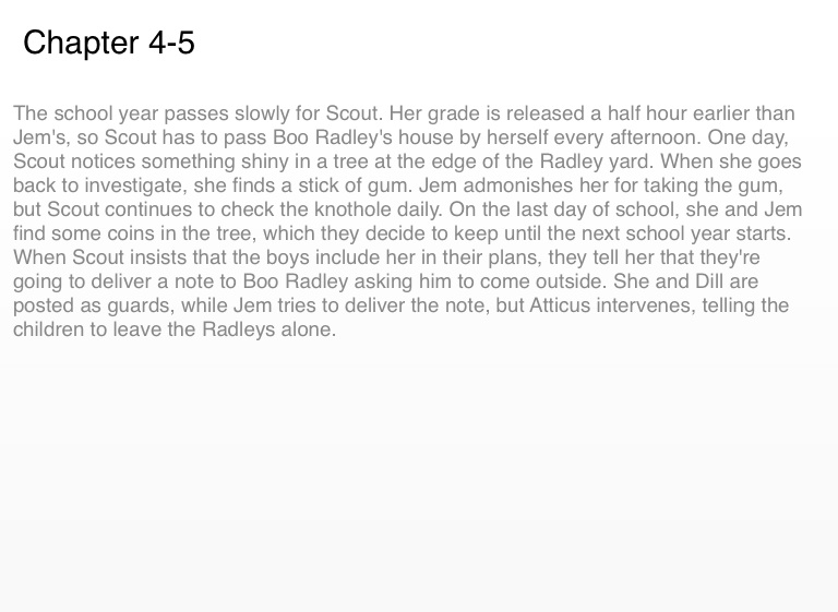 The school year passes slowly for Scout. Her grade is released a half hour earlier than Jem's, so Scout has to pass Boo Radley's house by herself every afternoon. One day, Scout notices something shiny in a tree at the edge of the Radley yard. When she goes back to investigate, she finds a stick of gum. Jem admonishes her for taking the gum, but Scout continues to check the knothole daily. On the last day of school, she and Jem find some coins in the tree, which they decide to keep until the next school year starts.