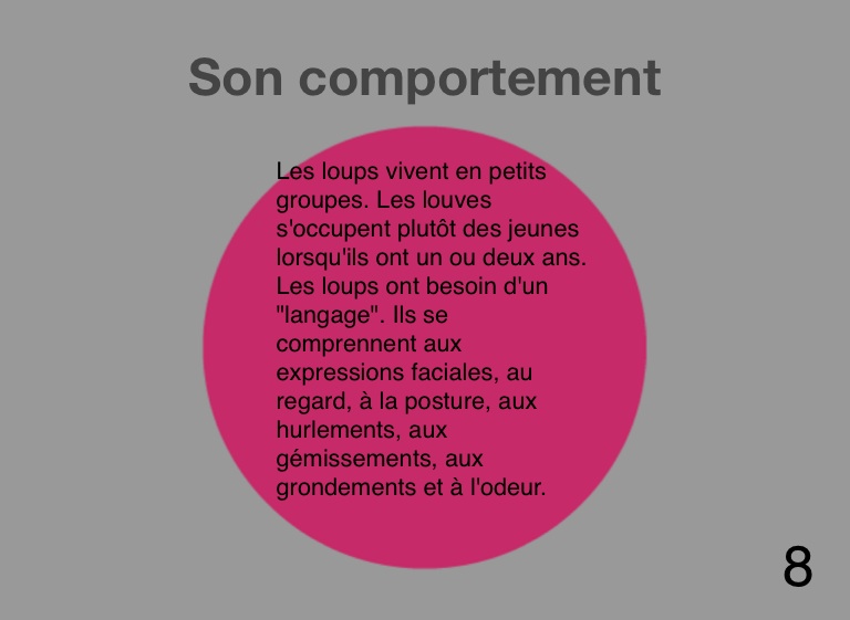 Les loups vivent en petits groupes. Les louves s'occupent plutôt des jeunes lorsqu'ils ont un ou deux ans. Les loups ont besoin d'un "langage". Ils se comprennent aux expressions faciales, au regard, à la posture, aux hurlements, aux gémissements, aux grondements et à l'odeur.