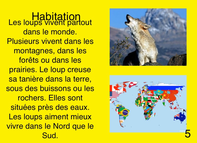 Les loups vivent partout dans le monde. Plusieurs vivent dans les montagnes, dans les forêts ou dans les prairies. Le loup creuse sa tanière dans la terre, sous des buissons ou les rochers. Elles sont situées près des eaux. Les loups aiment mieux vivre dans le Nord que le Sud.