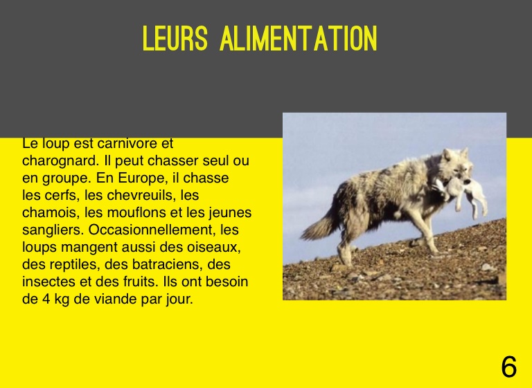 Le loup est carnivore et charognard. Il peut chasser seul ou en groupe. En Europe, il chasse les cerfs, les chevreuils, les chamois, les mouflons et les jeunes sangliers. Occasionnellement, les loups mangent aussi des oiseaux, des reptiles, des batraciens, des insectes et des fruits. Ils ont besoin de 4 kg de viande par jour.