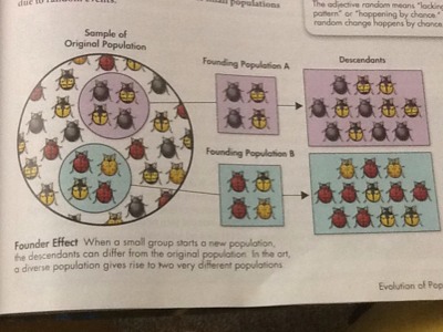 Genetic drift may be caused by the bottleneck effect or the founder effect.