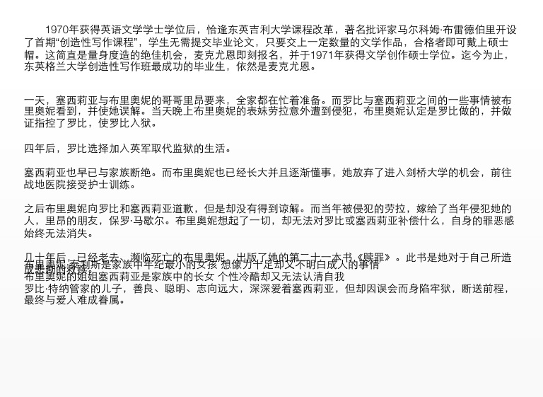 1970年获得英语文学学士学位后,恰逢东英吉利大学课程改革,著名批评家马尔科姆·布雷德伯里开设了首期“创造性写作课程”,学生无需提交毕业论文,只要交上一定数量的文学作品,合格者即可戴上硕士帽。这简直是量身度造的绝佳机会,麦克尤恩即刻报名,并于1971年获得文学创作硕士学位。迄今为止,东英格兰大学创造性写作班最成功的毕业生,依然是麦克尤恩。