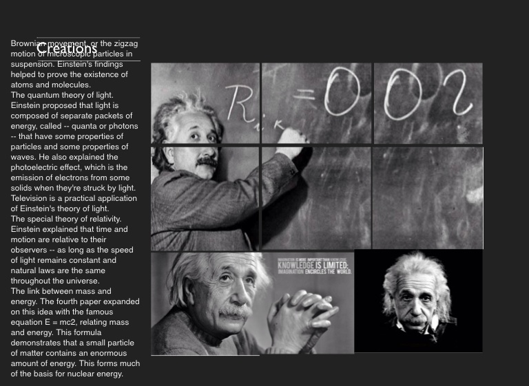 The quantum theory of light. Einstein proposed that light is composed of separate packets of energy, called -- quanta or photons -- that have some properties of particles and some properties of waves. He also explained the photoelectric effect, which is the emission of electrons from some solids when they're struck by light. Television is a practical application of Einstein's theory of light.