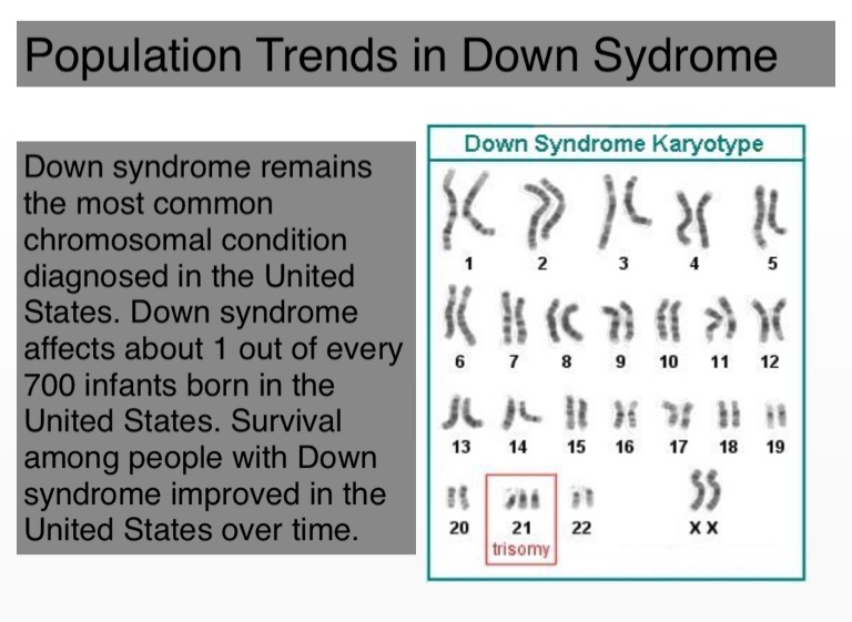 Down syndrome remains the most common chromosomal condition diagnosed in the United States. Down syndrome affects about 1 out of every 700 infants born in the United States. Survival among people with Down syndrome improved in the United States over time.