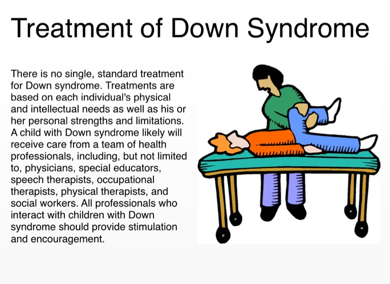 There is no single, standard treatment for Down syndrome. Treatments are based on each individual's physical and intellectual needs as well as his or her personal strengths and limitations. A child with Down syndrome likely will receive care from a team of health professionals, including, but not limited to, physicians, special educators, speech therapists, occupational therapists, physical therapists, and social workers. All professionals who interact with children with Down syndrome should provide stimulation and encouragement.
