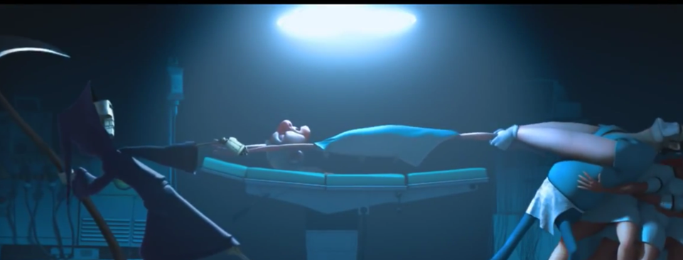 This is from The Lady and the Reaper. In this scene, "death" and life are fighting for the old lady. This film shows exaggeration because the lady is conscious and she sees this happening and this wouldn't really happen in real life.