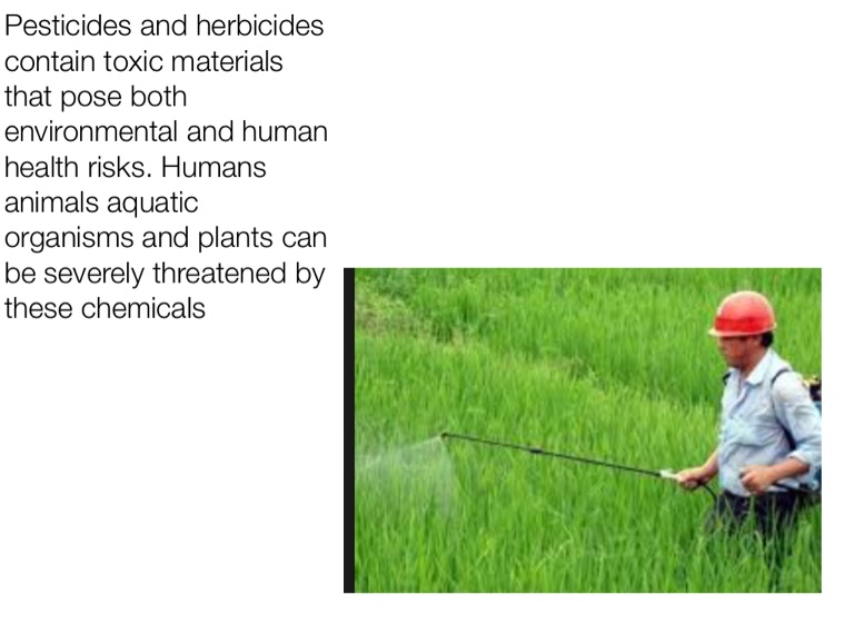 Pesticides and herbicides contain toxic materials that pose both environmental and human health risks. Humans animals aquatic organisms and plants can be severely threatened by these chemicals