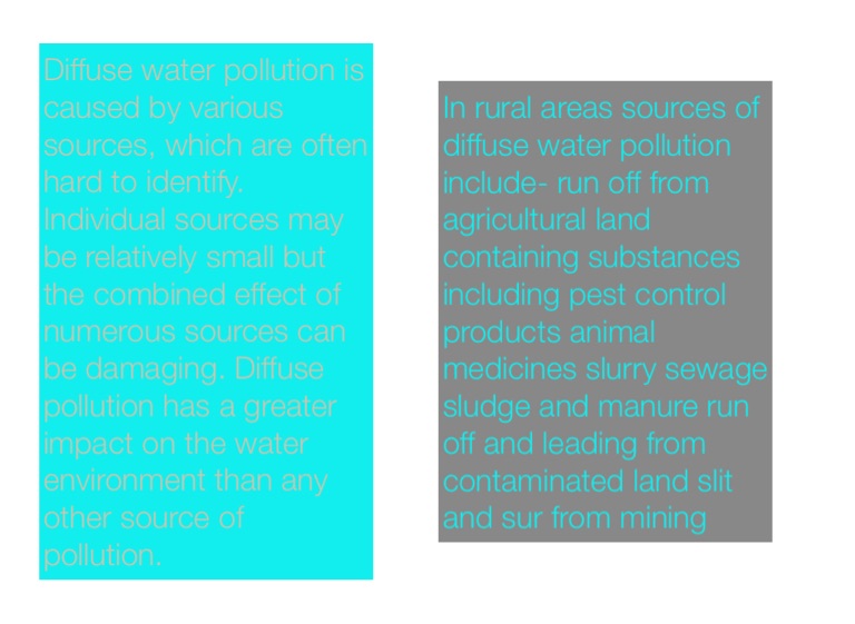 In rural areas sources of diffuse water pollution include- run off from agricultural land containing substances including pest control products animal medicines slurry sewage sludge and manure run off and leading from contaminated land slit and sur from mining