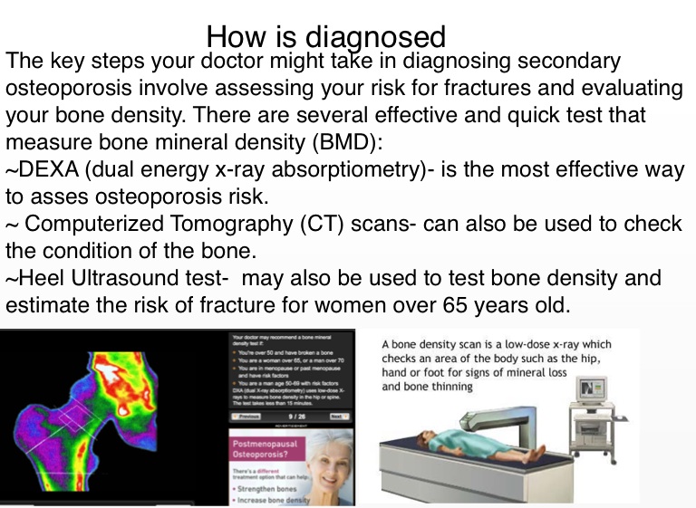 The key steps your doctor might take in diagnosing secondary osteoporosis involve assessing your risk for fractures and evaluating your bone density. There are several effective and quick test that measure bone mineral density (BMD):