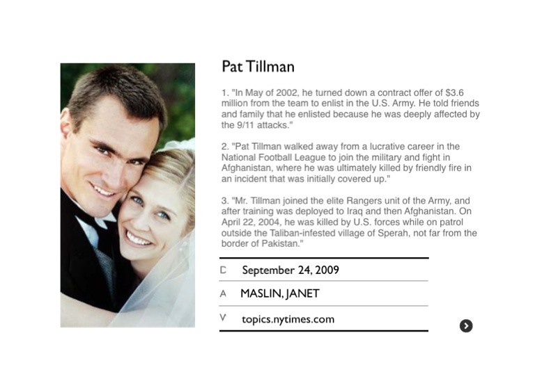 3. "Mr. Tillman joined the elite Rangers unit of the Army, and after training was deployed to Iraq and then Afghanistan. On April 22, 2004, he was killed by U.S. forces while on patrol outside the Taliban-infested village of Sperah, not far from the border of Pakistan."