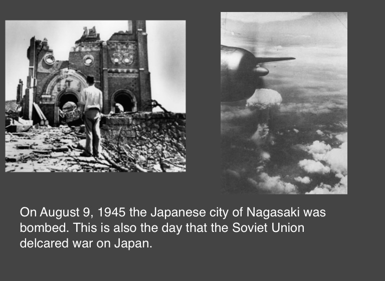 On August 9, 1945 the Japanese city of Nagasaki was bombed. This is also the day that the Soviet Union delcared war on Japan.