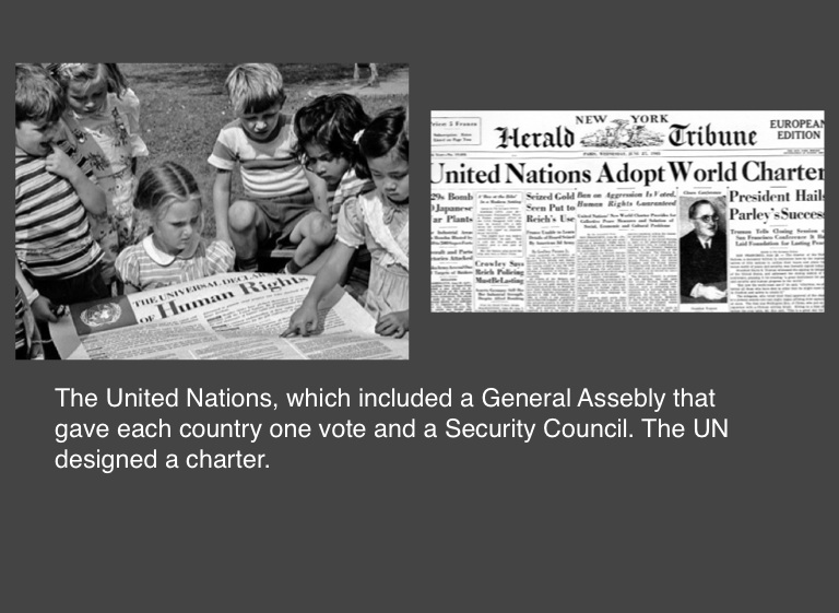 The United Nations, which included a General Assebly that gave each country one vote and a Security Council. The UN designed a charter.