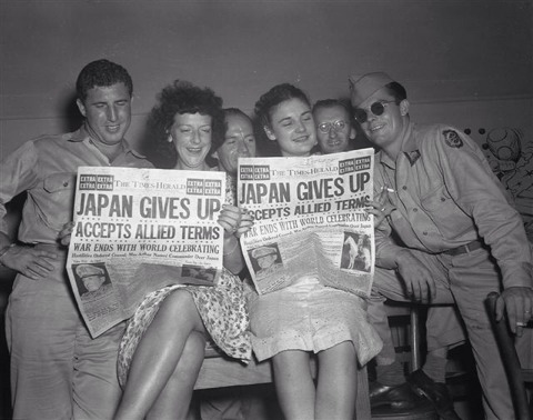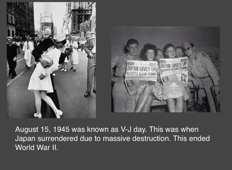 August 15, 1945 was known as V-J day. This was when Japan surrendered due to massive destruction. This ended World War II.