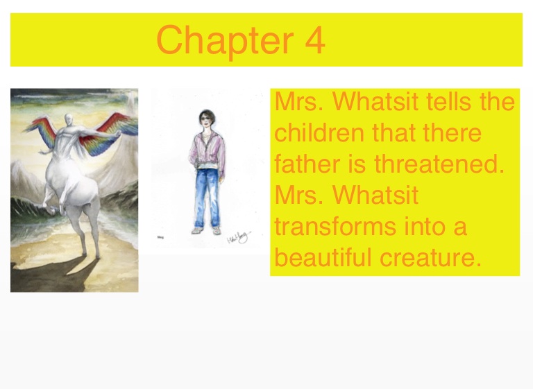 Mrs. Whatsit tells the children that there father is threatened. Mrs. Whatsit transforms into a beautiful creature.
